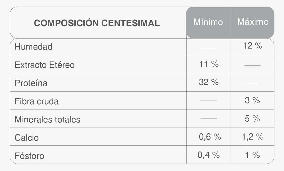 Harina de pollo, arroz, gluten de maíz, harina de pescado, harina de carne vacuna, arveja, aceite de pollo, aceite de pescado (fuente de omega 3 y 6), pulpa de remolacha (fuente de fructo-oligosacáridos-FOS), levadura de cerveza, hidrolizado proteico de menudencias porcinas, sal yodada, fibra insoluble (celulosa), acidificante en polvo (bisulfato ácido de sodio), extracto de yucca schidigera, L-carnitina, lisina, taurina, metionina, ácido cítrico, lecitina, tocoferoles, extracto de romero, dipropionato de calcio, ácido propiónico, núcleo vitamínico-mineral; vitaminas A, D3, E, K, B1, B2, B6, B12, ácido fólico, ácido nicotínico, pantotenato de calcio, biotina, colina, minerales; zinc, hierro, cobre, yodo, manganeso y selenio.