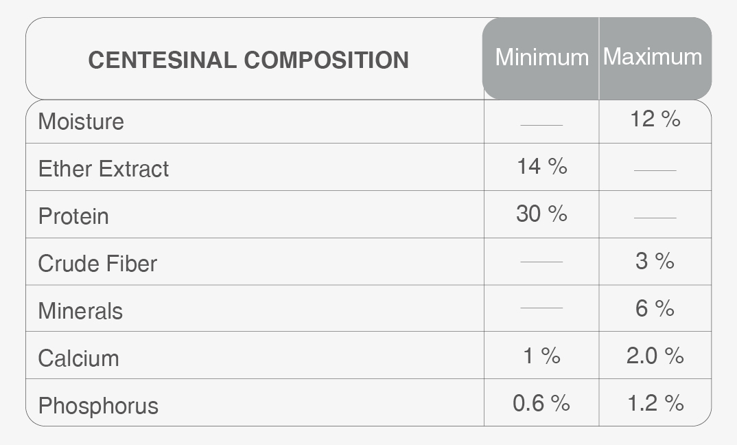 Chicken meal, rice, corn gluten, powdered albumin, powdered bovine plasma, wheat, animal fat (chicken), fish oil (source of omega 3), hidrolyzated of pork viscera, beet pulp (source of fructose -oligosaccharides - FOS), brewer's yeast, insoluble fiber source (cellulose), salt, powdered acidifier (sodium bisulfate acid), yucca schidigera extract, mannan oligosaccharides - MOS, yeast nucleotides, calcium carbonate, propionic acid, sodium bisulfate, manganese oxide, methionine, natural antioxidants: rosemary extract, citric acid, vitamin C, beta-carotene, lutein, polyphenols, taurine, vitamins: A, D3, E, K, B1, B2, B6, B12 , folic acid, nicotinic acid, calcium pantothenate, biotin, choline, minerals: zinc, iron, copper, iodine, selenium.