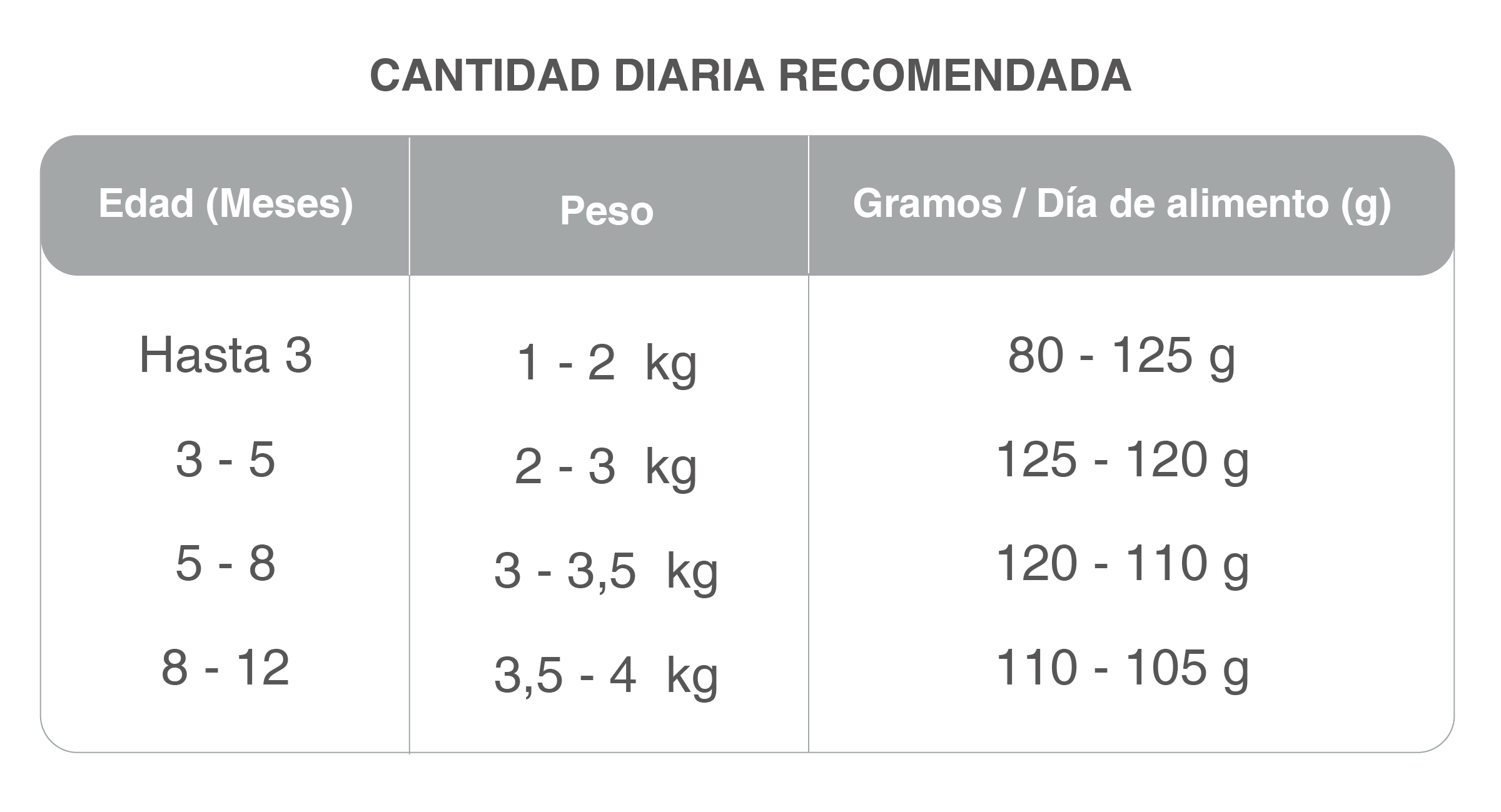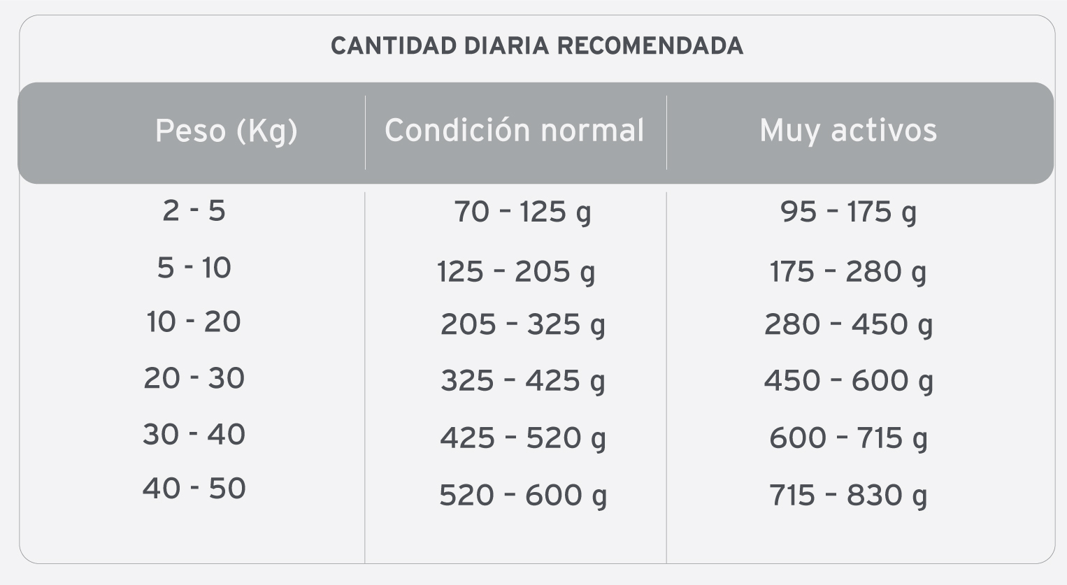 Harina de carne, harina de pescado, arroz, maíz, gluten de maíz, trigo, harina de soja micronizada, levadura de cerveza, grasa de pollo y aceite vegetal preservados con antioxidantes naturales, aceite de pescado (fuente de omega 3), azúcar, extracto de yucca schidigera, saborizantes naturales, vitaminas A, D3, E, K, B1, B2, B6, B12, ácido fólico, ácido nicotínico, pantotenato de calcio, biotina, colina; minerales: zinc, hierro, cobre, yodo, manganeso y selenio.